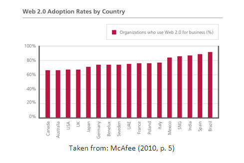A 2010 study revealed a number of interesting results in regard to Web 2.0 adoption rates by business. Conducted by McAfee, a team of experts and Vanson Bourne, over 1,000 participant organisations were surveyed across 17 countries. For the purposes of this study,